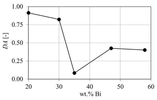 The geometric orientation is analyzed using the MIL tensor and DA parameter, where DA = 0 is spatial isotropy and DA = 1 fully anisotropic [46]. Eigenvalues and eigenvectors of the ellipsoid on the MIL tensor are given in Appendix C in Table A1 and the respective ellipsoids are provided in Appendix C in Figure A7. Figure 9 shows the DA over composition, where the Sn-20 wt.% Bi alloy reveals the highest degree of anisotropy. This is in agreement with the wide span of E and F in Figure 8a, which indicated a flat and elongated microstructure. Furthermore, the Sn-35 wt.% Bi gives the lowest value of DA = 0.058, which is reflected by a low spread of E and F values in Figure 8c. A VOI size variation with respect to DA is given in Figure A6 and showed an insignificant variation with respect to VOI dimensions.