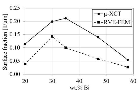 The eutectic surface fraction according to Equation (2) for the µ-XCT data and RVE-FE models is given in Figure 11. The µ-XCT data shows a maximum surface fraction for the Sn-35 wt.% Bi alloy, which corresponds to the interpenetrating network of eutectic- and primary phase observed in Figure 3 and Figure 4. Furthermore, it reveals that Sn-Bi alloys with around 50% eutectic phase fraction create the maximum number of phase boundaries. The RVE-FE model in Figure 11 properly reflects the tomography data. Yet, the surface fraction in the RVE-FE model is underestimated on average by roughly 50%, which arises from the voxel approximation. Therefore, the model in its presented form has limitations with respect to properties that require a quantitative representation of phase boundaries. Nevertheless, the general trend is fulfilled for alloys with 20, 30, 47 and 58 wt.% Bi. The phase boundary surface area with respect to VOI size is given in Figure A4.