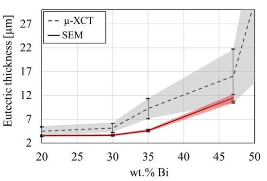 The eutectic thickness determined from µ-XCT data is shown in Figure 6. The eutectic thickness ranges from 3.6 µm for the Sn-20 wt.% Bi alloy to 73 µm for the Sn-58 wt.% Bi alloy. The data indicates a linearly increasing eutectic thickness among alloys with 20, 30, 35 and 47 wt.% Bi content. The Sn-58 wt.% Bi alloy shows the largest mean eutectic thickness and highest scatter of the measured values. Furthermore, a steep increase of mean eutectic thickness is observed from 47 to 58 wt.% Bi. The large scatter might arise from the dendritic microstructure and the large eutectic network observed in Figure 4e.
