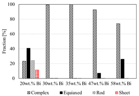 A volumetric classification is given in Figure 15, which shows the volume fraction of each morphologic class for all alloy composition. Detailed values can be found in Appendix D in Table A2. The Sn-20 wt.% Bi alloy is composed of complex, equiaxed, rod and sheet areas, where 40% of the microstructure is composed of equiaxed domains. The Sn-30 wt.% Bi and Sn-35 wt.% Bi alloys reveal complex microstructures due to the large eutectic and primary networks. In Table A2, insignificant fractions of equiaxed and rod-shaped domains are given. The Sn-47 wt.% Bi and Sn-58 wt.% Bi alloys are composed of equiaxed and complex domains, where the equiaxed areas have a minor volume fraction of 7% and 26%. Overall, the relative volume fractions in Figure 15 reveal similar morphologies among some of the investigated alloys. Three categories are suggested to group alloys with similar features. The Sn-20 wt.% Bi alloy represents a “mixed” microstructure with significant amounts of complex, equiaxed, rod and sheet domains. The Sn-30 wt.% Bi and Sn-35 wt.% Bi alloys show a “complex-dominated” structure with negligible contributions of equiaxed- and rod-shaped areas. Furthermore, the Sn-47 wt.% Bi and Sn-58 wt.% Bi alloys are summarized as “complex-equiaxed”, where the microstructure is dominated by complex areas with a significant presence of equiaxed domains. The data in Figure 15 suggests that alloys with eutectic phase fraction between 30 and 60% are complex dominated due to the formation of a fine network of eutectic phase. The dendritic primary phase for alloys with 47 and 58 wt.%Bi leads to a fraction of equiaxed domains of 7% and 26%.