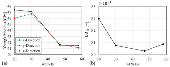 To investigate a possible correlation among geometric and elastic anisotropy, Young’s moduli were computed with the RVE-FE models. Figure 16 shows the elastic response over composition, where Figure 16a shows the moduli in each spatial direction of the unit cell. Figure 16b shows the elastic computed according to Equation (5). The Sn-20 wt.% Bi alloy shows the most pronounced orientation dependency, with a 1.4 GPa higher modulus in z-direction. This agrees with the equivalent ellipsoid stretched in z-direction in Figure A7. The remaining alloys show a negligible orientation-dependence. The elastic parameter in Figure 16b indicates an isotropic characteristic for all alloys. The highest anisotropy is found for the Sn-20 wt.% Bi alloy with . The similar elastic constants of primary and eutectic phase reduce the geometric anisotropy found in µ-XCT Data shown in Figure 9. Furthermore, it is important to discuss the effect of crystal anisotropy on the elastic properties. In principle, single grains or grain boundaries are hardly detected through lab-scale µ-XCT. Nevertheless, a similar approach was reported by Wijaya et al. [51], where the local crystal orientation of the microstructure was neglected and good correlation of experimental and numerical results of elastic properties was achieved. However, in case of solder joints, the local crystal anisotropy becomes a determining factor for solder joint reliability [52]. The body-centered tetragonal crystal structure causes an elastic and thermal expansion misfit, where large-angle grain boundaries act as damage initiation sites.