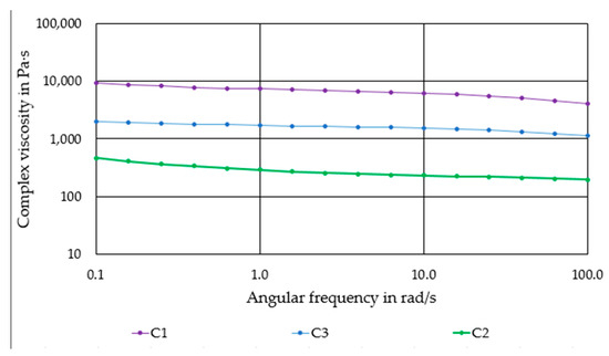 Complex viscosity of the produced compounds as a function of the angular frequency.