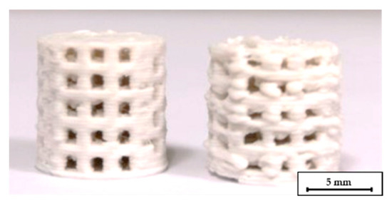 C2 based scaffolds printed at 205 °C, for the left one a 0.4 mm nozzle was used, for the right one a 0.5 mm nozzle.