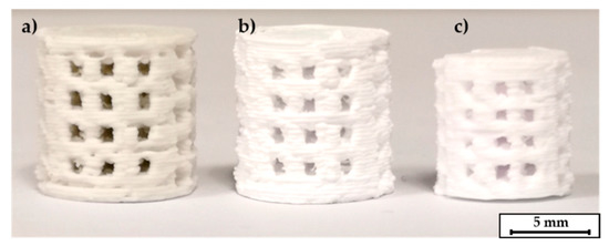 The following step of thermal debinding did not require a surrounding powder bed for the C2 based components. Both debinding strategies P1 and P2 were applicable. The open-pore network that was created after the dissolution of the PEG seems to be permeable enough to release the volatile components of the thermal debindering process. The specimens could withstand the thermal expansion of the residual PLA binder. A printed, a debindered, and a sintered C2 based scaffold are shown in Figure 6. The components retain their shape during the debindering and show a homogeneous shrinkage during final sintering. In contrast to this the C3 specimens could only be debindered in a dimensionally stable manner with the P2 program and the aid of the fine APA-05 powder. When the P1 program was used, the components did not keep their dimensions, see Figure 7a. This effect could be reduced by using a powder bed, but not completely eliminated. However, it was possible to debinder C3 based scaffolds successfully when the P2 program was used. Without a surrounding powder bed the dimensional accuracy was quite low, see Figure 7b. Better results were obtained when the debinding took place in an APA-05 powder bed, see Figure 7c. Using the coarse F100 powder was not effective here either.