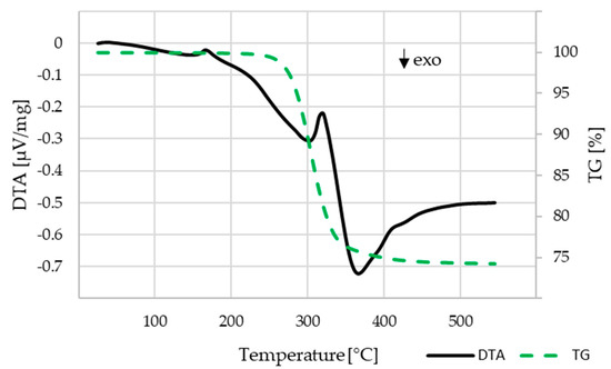 Differential-thermal-analyses and thermogravimetric analyses (DTA/TG) were carried out to study the thermal decomposition/debinding characteristics of the PLA and in order to measure the fraction of ceramics within the filaments. Therefore, a DTA/TG machine Netzsch STA 409 (Erich NETZSCH GmbH & Co. Holding KG, Selb, Germany) was used, the measurements were taken under air atmosphere in the range of 20 °C up to 550 °C with a heating rate of 10 K/min.