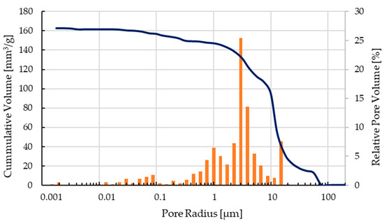 The mechanical characterization focused on C2 components as only these scaffolds could be printed, debindered, and sintered without difficulty and showed the best results after optical inspection. The pore size distribution of a sintered scaffold as shown in Figure 6 can be seen in Figure 9. The open porosity measured by the mercury porosimeter is about 35%. Most of the micropores are in the range between 0.4–12 µm, the calculated medium pore size was 9.8 µm.
