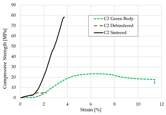 Stress-strain-curve for a C2 based green body, brown body, and sintered scaffold.