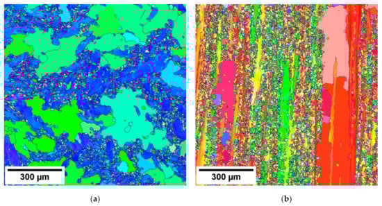 The inverse pole figure (IPF) taken from the section perpendicular to the extrusion direction (ED) is shown in Figure 1a and from the section parallel to the ED in Figure 1b. Big non-recrystallised grains are surrounded by the small ones which originated by the partial recrystallisation during the hot extrusion. The grain size distribution is significantly bimodal; the big grains exhibit the grain size 300 µm, while the small grain size is only 20 µm. The grain size of the samples is reported in Table 1.