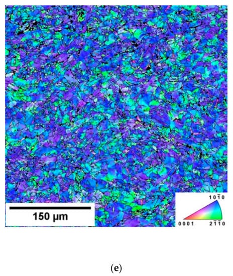 The AZ31B (3 wt%Al-1 wt%Zn-0.2 wt%Mn-balance Mg) bars were supplied by Luoyang Magnesium Gurnee Metal Material (Luoyang, China). Extruded rods were subjected to a repeated rotary swaging process. Rotary swaging machine with four-split die from HPM (Heinrich Müller Maschinenfabrik GmbH, Pforzheim, Germany) was used for the experiments. The swaging process was performed five times; an original diameter of 20 mm was reduced to 8 mm. The rods were preheated at a temperature of 450 °C. Samples prepared from the particular rods were depicted as 1 × swaged (SW1), 2 × swaged (SW2), and analogously SW3, SW4, SW5, and the original rod SW0. The microstructure was studied using an Auriga Compact scanning electron microscope (Carl Zeiss, Jena, Germany) equipped with an EBSD camera (EDAX LLC, Draper, UT, USA) and the OIM 7.3 software. Texture analysis was performed using series expansion of generalized spherical harmonics with the axial symmetry condition. Tensile and compression tests were performed at room temperature in an Instron 5882 testing machine (Instron, High Wycombe, UK) at an initial strain rate in the order of 10−3 s−1. The characteristic stresses as tensile/compression stress (TYS/CYS) and ultimate tensile strength (UTS) and peak compression strength (PCS) were estimated as a true stress at the strain 0.002 and the maximum true tensile/compressive stress. The strain hardening coefficient was calculated as the derivative of the stress—strain curve as . Cylindrical samples for the thermal expansion measurements have a length of 50 mm and a diameter of 6 mm. Samples were cut from the swaged rods so that the longitudinal axis of the samples was parallel to the extrusion direction. The measurements of sample elongation were performed in an argon atmosphere using a 410 dilatometer (NETZSCH-Gerätebau GmbH, Selb, Germany) over a temperature range from room temperature to 400 °C with heating and cooling rates of 0.9 K/min.