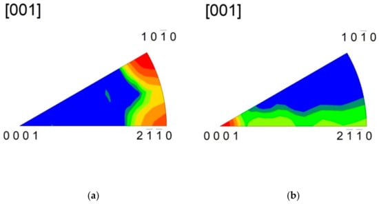 Inverse pole figures estimated for the extruded bar (SW0) taken from the section: (a) perpendicular to the ED and (b) parallel to the ED.