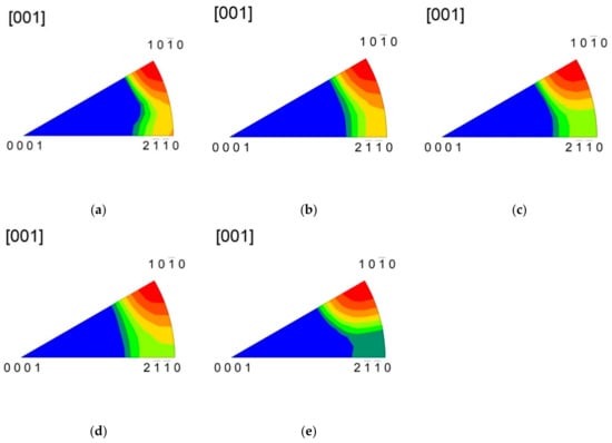 Inverse pole figures, taken from the section perpendicular to the ED, estimated for: (a) SW1, (b) SW2, (c) SW3, (d) SW4, and (e) SW5 samples.