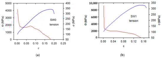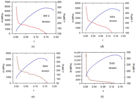 The work hardening coefficients calculated for curves obtained in tension: (a) SW0, (b) SW1, (c) SW2, (d) SW3, (e) SW4 and (f) SW5. σ-ε curves are drawn in the blue colour and Θ-ε curves in red.