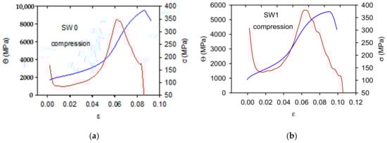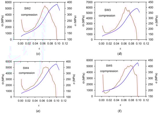 Strain dependence of the work hardening coefficients calculated for the curves obtained in compression: (a) SW0, (b) SW1, (c) SW2, (d) SW3, (e) SW4 and (f) SW5. σ-ε curves are drawn in the blue colour and Θ-ε curves in red.