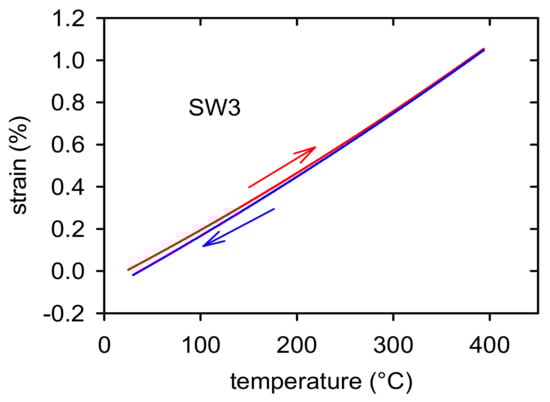 Thermal strains were measured in the temperature region from room temperature up to 400 °C with the aim to estimate possible residual thermal stresses in samples after the thermomechanical treatment. The sample elongation vs. temperature plot measured while heating and cooling is shown in Figure 7 for the SW3 sample as an example of such measurement. It is obvious that the heating and cooling branches follow a different course. Some shortening was observed in all samples. This shortening is a consequence of a relaxation of elastic stresses existing in the samples after rotary swaging. In the next thermal cycle, the heating and cooling branches were found to be identical.