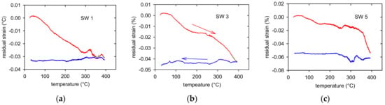 The course of these residual stresses depending on temperature is shown in Figure 8 for three samples. It is obvious that the permanent shortening of samples depends on the RSW counts. The permanent residual strains, estimated after the first heating-cooling cycle, are done in Table 2 for all samples.