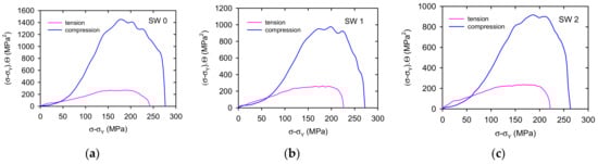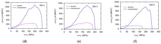 (σ − σY). Θ vs. (σ − σY) plots constructed for curves estimated in tension and compression for (a) SW0, (b) SW1, (c) SW2, (d) SW3, (e) SW4, (f) SW5.