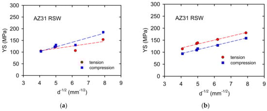 The TYS and CYS values plotted against d−1/2, where d is the grain size, are shown in Figure 10a. It is noticeable that the yield stress values were estimated higher for compression compared with the values measured for tension. This result is surprising because in textured magnesium materials the opposite tendency is usually measured, i.e., the yield stresses estimated in compression are lower than those in tension [29].
