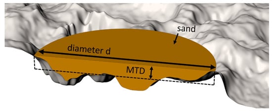 Principally, the occurring sand patch after performing the sand patch method can be regarded as an approximation for a cylinder with an irregular depth (or height respectively). With the knowledge of the volume of the applied amount of sand and the diameter of the sand patch, the mean height —in terms of the sand patch method also referred as mean texture depth ()—can be calculated using the rearranged formula for the volume of a cylinder. The mean texture depth can thus be determined in the following way: