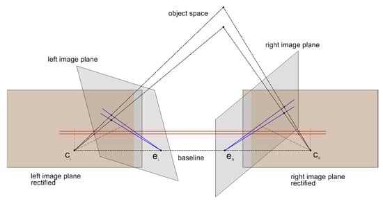 Epipolar geometry—initial image planes (gray) and stereo rectified images planes (orange).