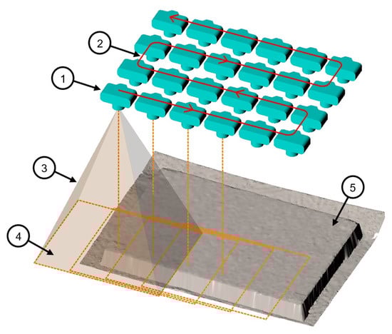 Concept of the recording geometry. 1—camera position; 2—camera trajectory; 3—field of view pyramid; 4—imaging area; 5—concrete surface.