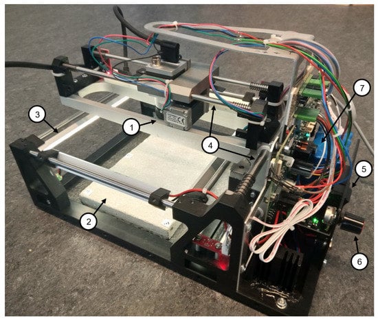 Camera-based measurement system. 1—Industrial camera; 2—concrete specimen; 3—one of the four LED strips; 4—both moving axes; 5—power switch; 6—rotary switch for illumination adjustment; 7—rechargeable battery.