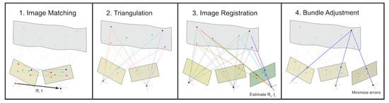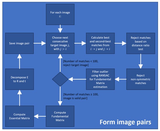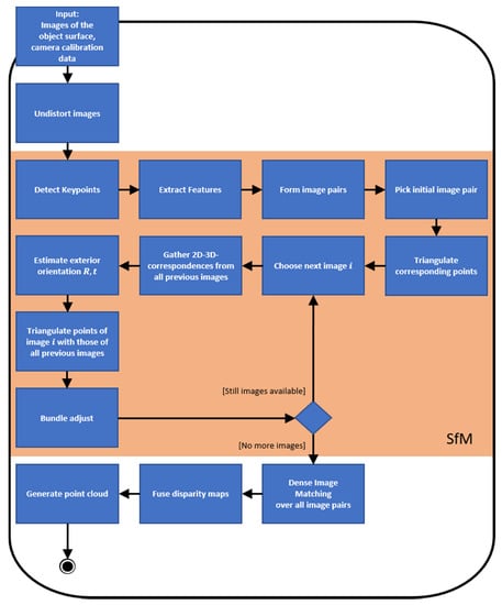 Although there are already software applications, which perform photogrammetric pipelines for 3D reconstruction (such as Agisoft Metashape [36]), we developed our own workflow, which fulfills our specific needs and furthermore is independent of commercial products. Hence, to perform 3D reconstruction of object surfaces using images taken by the calibrated industrial camera, we implemented an image matching pipeline, which includes both Structure from Motion (SfM) and Dense Image Matching (DIM) procedures. We use the SfM algorithm to refine the pose of the camera, which is roughly pre-determined due to the configured recording geometry. After determining the exact poses of the camera, we use DIM to obtain disparity maps of all image pairs and further, using these, we generate a point cloud of the scene as dense and gapless as possible. Our complete pipeline for incremental 3D reconstruction is presented in the following diagram (Figure 8).