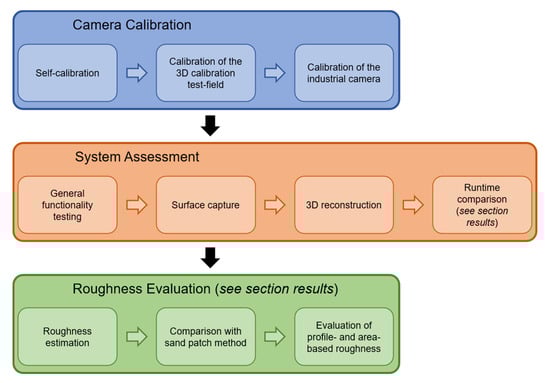 Following this introduction, this paper is organized as follows: Section 2 gives an overview of recent developments regarding methods for measurements on concrete surfaces. In Section 3, we provide some necessary fundamentals, in particular a brief definition of roughness and the basics of digital photogrammetry. Subsequently, in Section 4, the developed measurement system is introduced. This includes the concept for capturing the images of object surfaces, the hardware used to build the prototype, and the custom-built 3D calibration test-field. In Section 5, the methodology for 3D reconstruction and roughness estimation is provided. Following this, Section 6 covers our investigations into camera calibration and trials at estimating the roughness of 18 concrete specimens. Section 7 presents and discusses our results. Finally, in Section 8, we present our conclusions with an additional insight into future work.