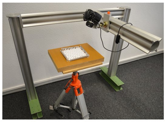 The prototype of the measurement system consists of a cross slide with a controlling unit and propulsion, which guides an industrial camera in a meandering path automatically over the surface to be measured. The camera is moved on two axes and images are taken in stop and go mode. Subsequently, the captured images are transferred to a measurement computer via USB. Recording time depends on the number of images and the configured degree of overlap. It currently takes 30 images in around 5 min (5 images in -direction and 6 images in -direction). We use a Basler acA3800-14um monocular industrial camera (Ahrensburg, Schleswig-Holstein, Germany). Some main camera specifications are shown in Table 2.