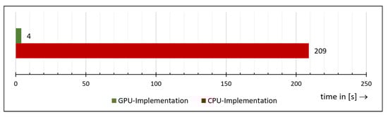 Comparison of the total runtime between the pure CPU implementation and the Graphics Processing Unit (GPU)-accelerated implementation.