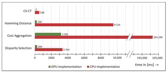 For a more detailed comparison, we further plotted the runtime of every main algorithm of the SGM pipeline in Figure 18. The chart shows that basically each algorithm benefits from GPU acceleration. This is because the algorithms used by SGM are suitable for parallelization.