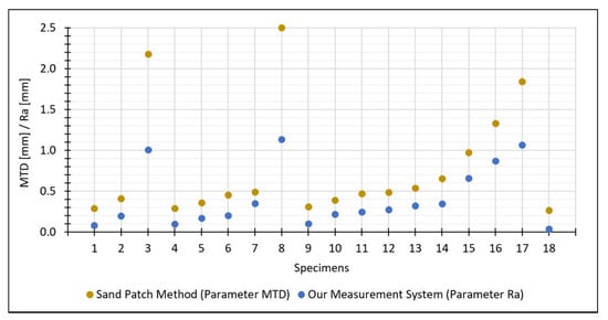 The 18 concrete specimens were used to compare the results of our proposed measurement system with those obtained using sand patch method. For this purpose, we plotted our estimated results for the parameter and the reference values for the parameter determined by the sand patch method in Figure 19.