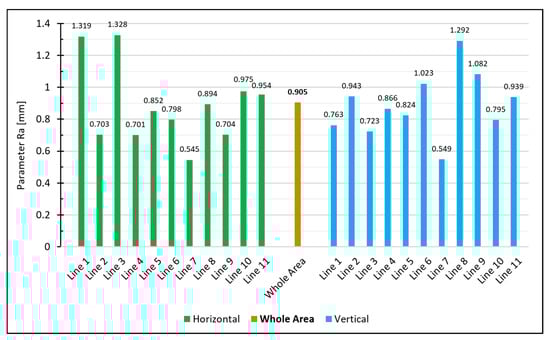 Calculating, e.g., the roughness parameter for that specimen in the area-based way leads to 0.905 mm. For comparison with the line-wise calculation, we extracted 11 equally spaced lines both in the horizontal and vertical directions from the same point cloud. The extracted lines have a spacing of 4 cm. Calculating the line-based roughness parameter leads to the following measurement series: