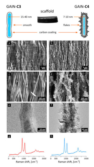 The schematic representation of synthesized GAIN scaffolds and their structure from SEM and TEM images for the type “C3” (a,c,e) and “C4” (b,d,f), together with their respective Raman spectra (g,h).
