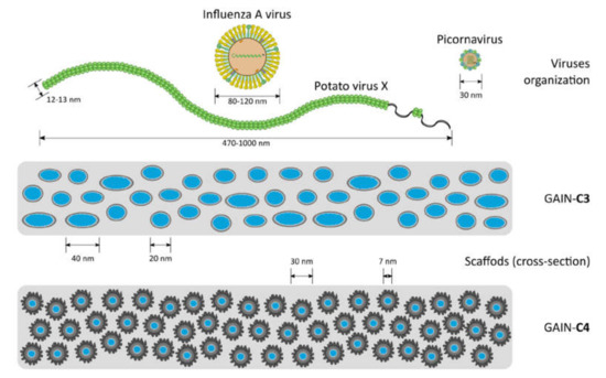 Three different virus types were used in this work (Table 1). The dimensions of these viruses to GAIN scaffolds are schematically shown in Figure 2. It is seen that sterically these viruses are substantially different so it is expected they will interact with the GAIN scaffolds also in a different way.