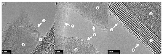 TEM images of graphene coatings around the alumina nanofiber (pictures (a–c) represent different locations). Label (1) points to stacked carbon layers, (2) marks a substrate nanofiber, and (3) shows outer highly defective layer.
