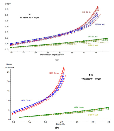 The data of Figure 4a were normalized by converting a force into a stress and deformation into a strain (as specimens had different dimensions). The stress-strain curves for 1 Hz and for 10 cycles of loading are presented in Figure 4b indicating a remarkable difference between C3 and C4. The C3 substrate undergoes nearly linear behavior in all studied range of strains; nonetheless, the material C4 (either dry or wet state) deviates from the linearity already after 1.5% of strain.