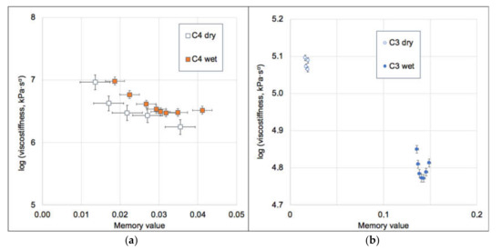 Dependence of the GAIN viscostiffness at 1 Hz vs. their memory values for C4 (a) and C3 (b). Error bars represent standard error. Note significant differences of memory value between wet and dry C3 scaffolds, but very close values for C4.