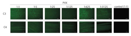 Detection of potato virus X (PVX) on C3 and C4 scaffolds using immunofluorescence. The tested dilutions of infected plant lysate are indicated above the figure (control = non-infected lysate). Color corresponds to presence of PVX C and reflects binding to scaffold. Bar = 50 µm.