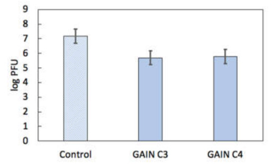 To check if IAV binding to GAIN scaffolds would be beyond detection limits of experiments, 1 mL of diluted IAV stock (5 × 104 pfu/mL) was again incubated with C3 and C4 GAIN scaffolds (n = 6), and the IAV titre was quantitated before and after incubation as described above. Virus titre before incubation with the scaffolds was 5 × 104 pfu/mL. Virus titre after incubation with C3 scaffolds was 8.5 × 104 pfu/mL and after incubation with C4 scaffolds was 3 × 104 pfu/mL. This result also has indicated no apparent drop of IAV titre after incubation with C3 and C4 scaffolds, supporting previous observation that IAV does not seem to interact with GAIN scaffolds (Figure 8).