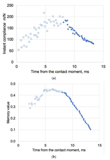 (a) Instant mechanical compliance (m/N) of IAV by AFM recalculated from data [36] and (b) respective memory values. Open symbols are for Phase I and closed for Phase II deformation as presented in [36]. Maximal compliance values are in this case corresponding to maximal memory values.