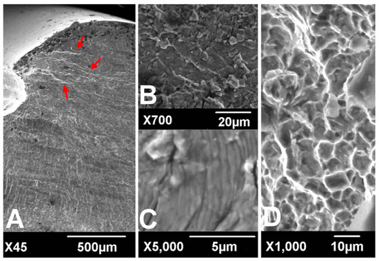 Scanning electronic microscopic findings of fracture surfaces. River marks (red arrows) originate from the thread crest (A). Transgranular cracking (B) with striations perpendicular to the river marks (C) was observed at the crack propagation zone. Dimpled ductile fractures were observed at the overload zone (D). (according to [6]).