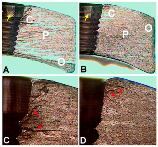 Optical microscopic images of fracture surfaces. There are three zones indicating fatigue fracture (A,B) and the magnified views of the crack initiation sites (C,D). C represents the crack initiation zone. P represents the crack propagation zone. O represents the final overloading zone. Red arrows point to the crack lines. Yellow arrows point to the machining lines at the screw holes. (according to [6]).