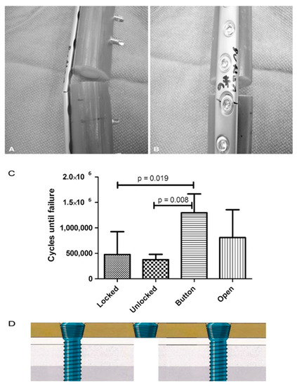 (A,B) All plates failed through a screw hole adjacent to the defect as is seen on the (A) left and (B) right in these representative Button samples. (C) The fatigue life in cycles to failure is shown for each plate and screw configuration. (according to [46]). (D) The authors did not to date test the strength of the construct near the fracture site for using a single button.