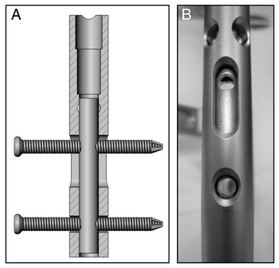 (A,B) Prior to implantation of the nails, a micromotion insert was placed in the proximal cannulus of each nail. An insert in the proximal nail stem was used to align two 3.9-mm locking bolts—one in the dynamic slot and one in the 5-mm static locking hole. This configuration produced 1.1 mm of free axial travel (according to [54]).