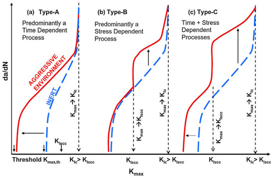 Compound interactions, like ion exchange or adsorption of proteins, determine the quality and stability of the bone-implant-interface [70]. These redox-reactions may cause conformational variations of biological macromolecules transforming native proteins into antigens which notify the immunological system to recognize an artificial implant as a foreign body [71]. Besides, the surface of the implant can become a fascinating battleground for the spontaneous degeneration and infiltration with inflammatory cells [72,73]. The degradation products are in turn liable to incite aseptic inflammation. The former can produce toxic side-effects, while the later can lead to a total loss of material cohesion [74]. Some relevant studies have conducted a deep analysis of the stress intensity threshold for fatigue (Kmax,th) in corrosive media [75]. The results indicated that corrosive environment possesses a time-dependent attribute, contributing to fatigue crack growth even when stress intensity factor (Kmax) is less than stress intensity threshold for stress corrosion cracking (KIscc) (Figure 5).