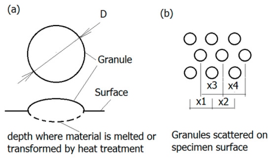 Granular surface: (a) Geometry of granules—The region of melted and transformed material is marked dashed line; (b) granules displacement on the surface (according to [78]).