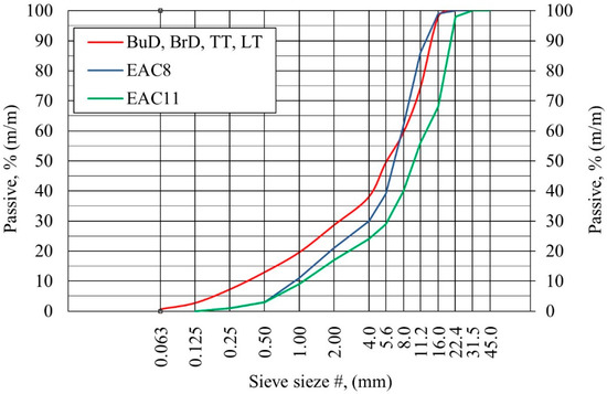 In the case of the EAC, two types of aggregate, differing in maximum grain size, were used: 0/8 mm (EAC8) and 0/11 mm (EAC11). The remaining concrete pavement samples, textured with the BuD, BrD, TT and LT methods, were made with aggregate 0/16 mm. A trachybasalt was used as coarse aggregate.