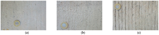 Transverse and longitudinal tining, and burlap and brush drag were performed on the fresh concrete mixtures, immediately after compacting each slab. The EAC method was carried out in two stages—immediately after compaction, the top surface of the slab was sprayed with a hydration-retarding agent based on paraffin wax and polyalcohol, and after about 24 h the non-hydrated layer of cement mortar was removed with a steel brush, which left the exposed grains of coarse aggregate. Figure 2 shows images of the top surfaces of the tested concrete slabs.