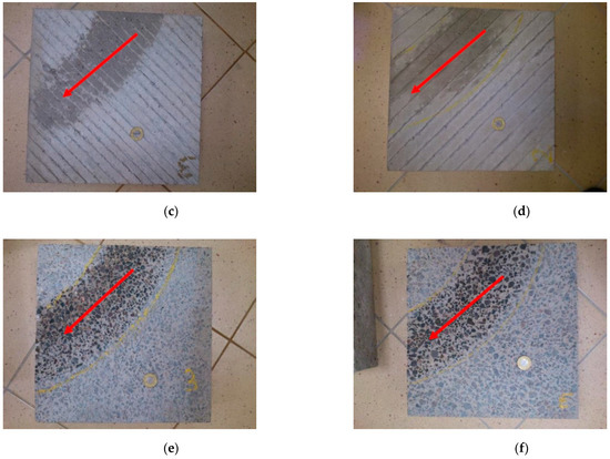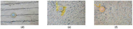 Textures of concrete pavements with the marked measurement direction of the British pendulum tester: (a) BuD, (b) BrD, (c) TT, (d) LT, (e) EAC8, (f) EAC11 (diameter of the presented coin is 21.5 mm).