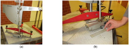 Skid resistance was determined on the basis of BPN measurements in accordance with ASTM E303-93 [55] (Figure 4a). The shift length of the rubber slider was 126 ± 2mm (Figure 4b). The measurements were made in the traces left by the polishing wheels on the surfaces of the specimens before and after the individual phases. Three replicate passes were performed on each tested specimen. Before each measurement using the British pendulum tester, each specimen was thoroughly washed—corundum and fine pollutions were removed. This procedure is also performed in other devices of this type, e.g., in the FAP device (known as Wehner/Schulze, Wennigsen, Germany).